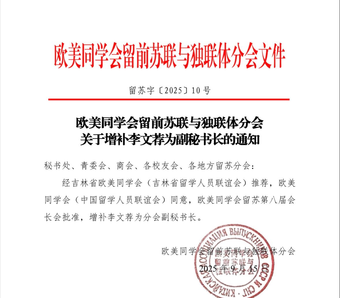 近日,经吉林省欧美同学会(留学人员联谊会)推荐,欧美同学会(中国留学人员联谊会)留前苏联与独联体分会(简称“留苏分会”)增补学校欧美同学会会员李文荐为分会副秘书长。